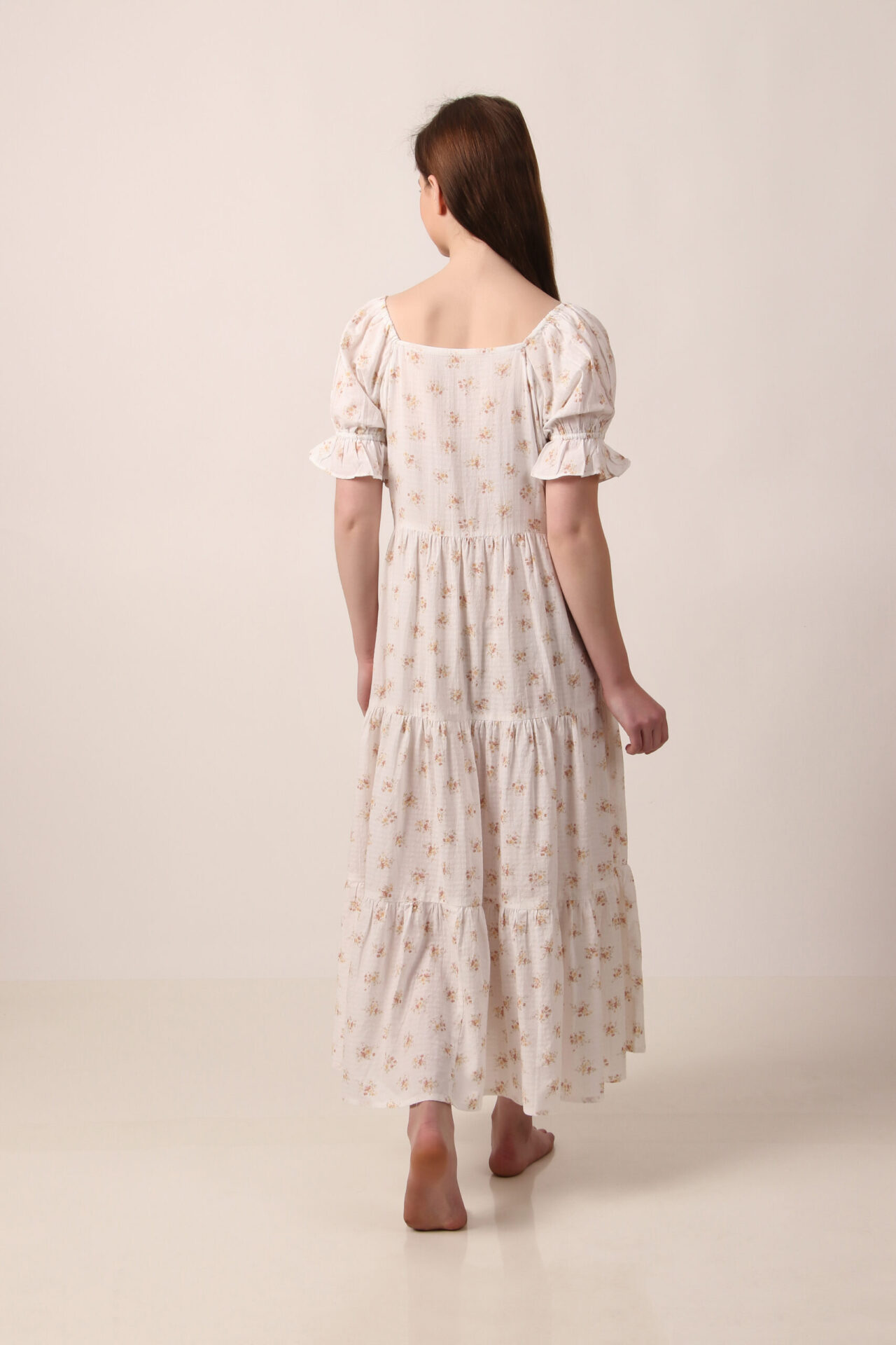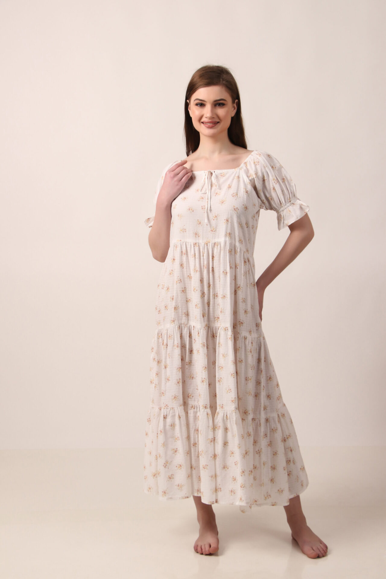 The Carolyn Floral Dress has a lovely flowy silhouette and lightweight and breathable soft cotton. The Gather under yoke makes the garment roomy and comfortable. Carolyn Floral Dress features a soft Elasticated neckline and puffy sleeve.