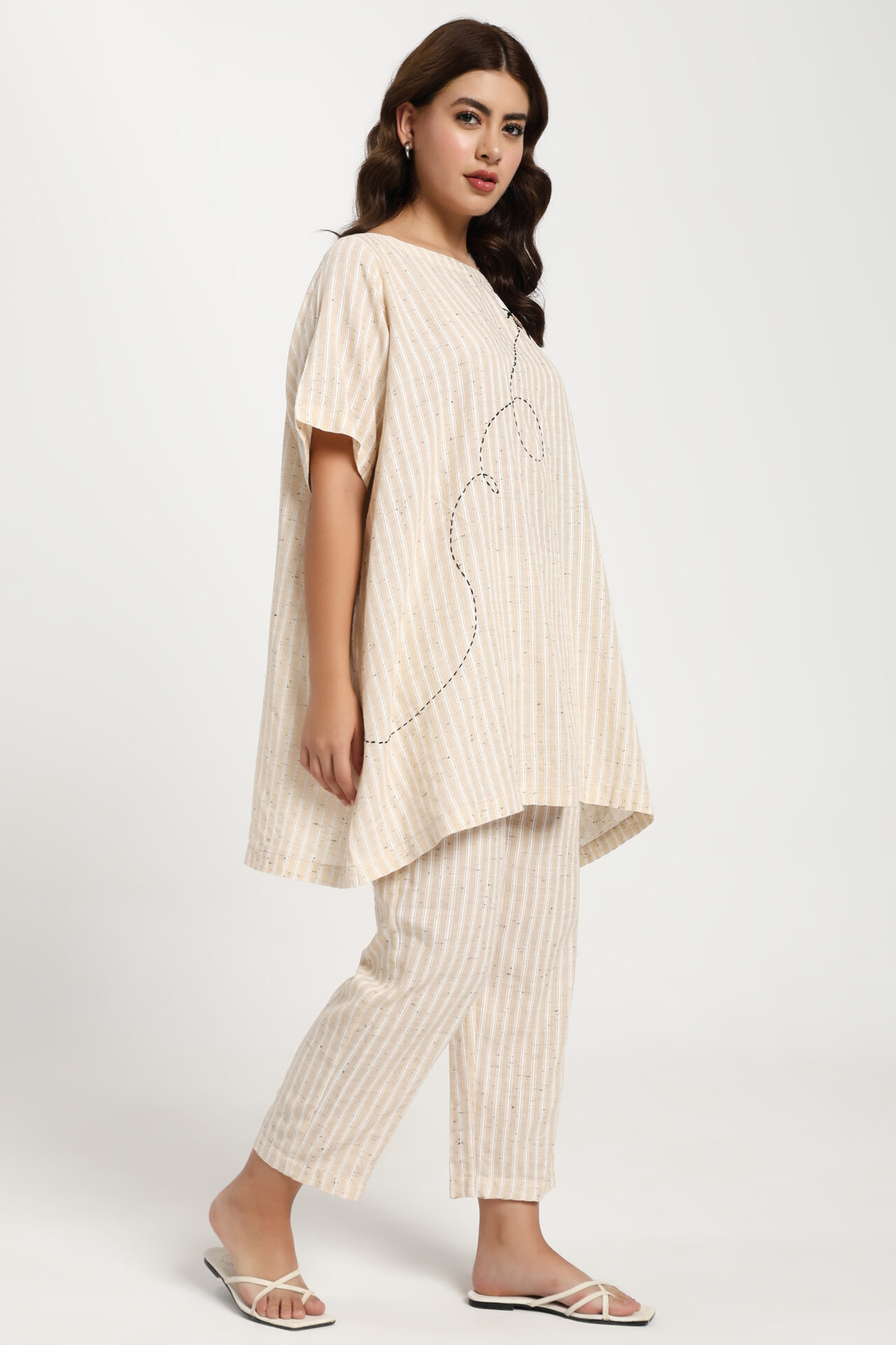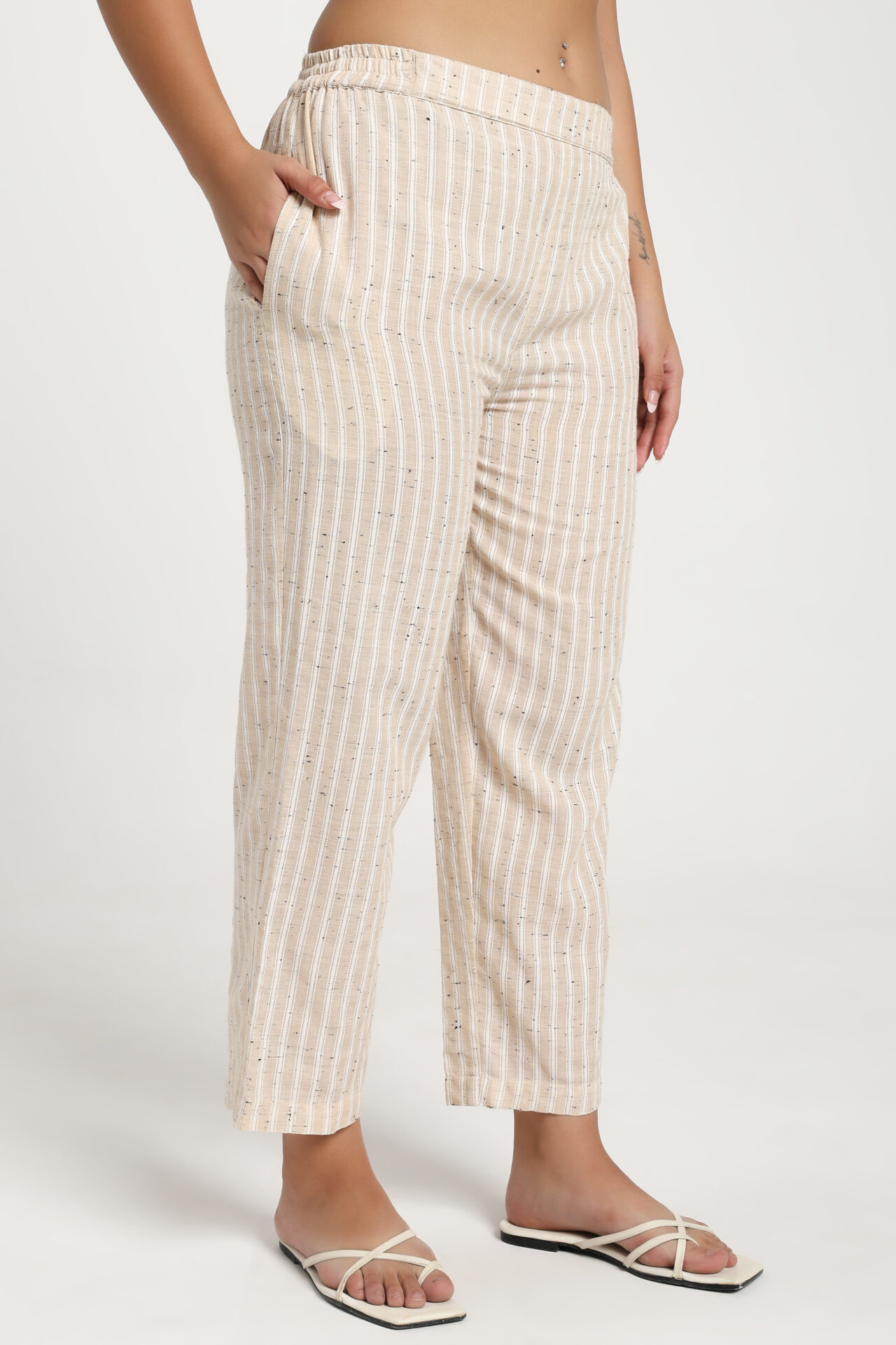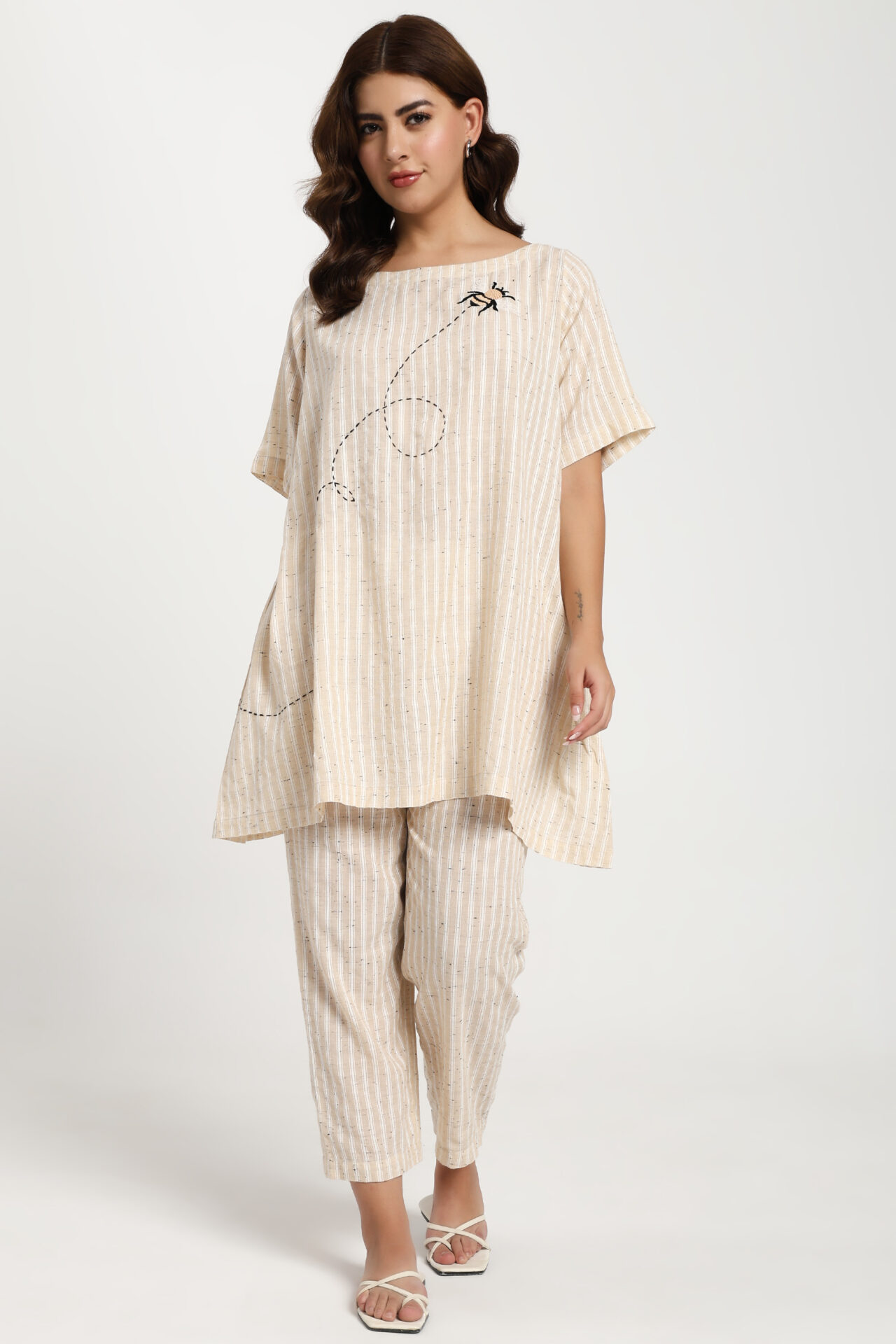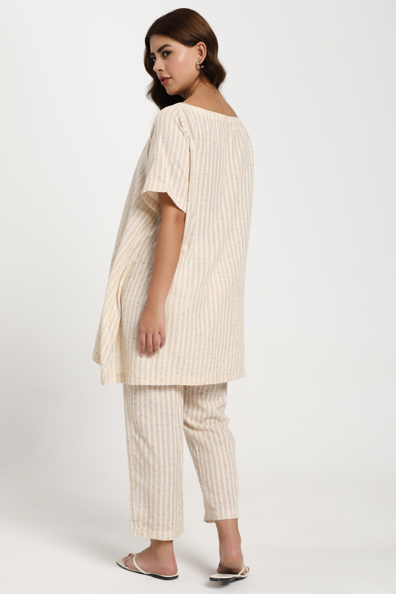 Made in soft cotton dobby fabric in beige color with white textured stripes.
